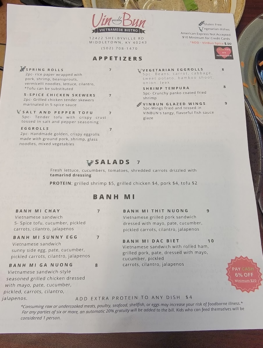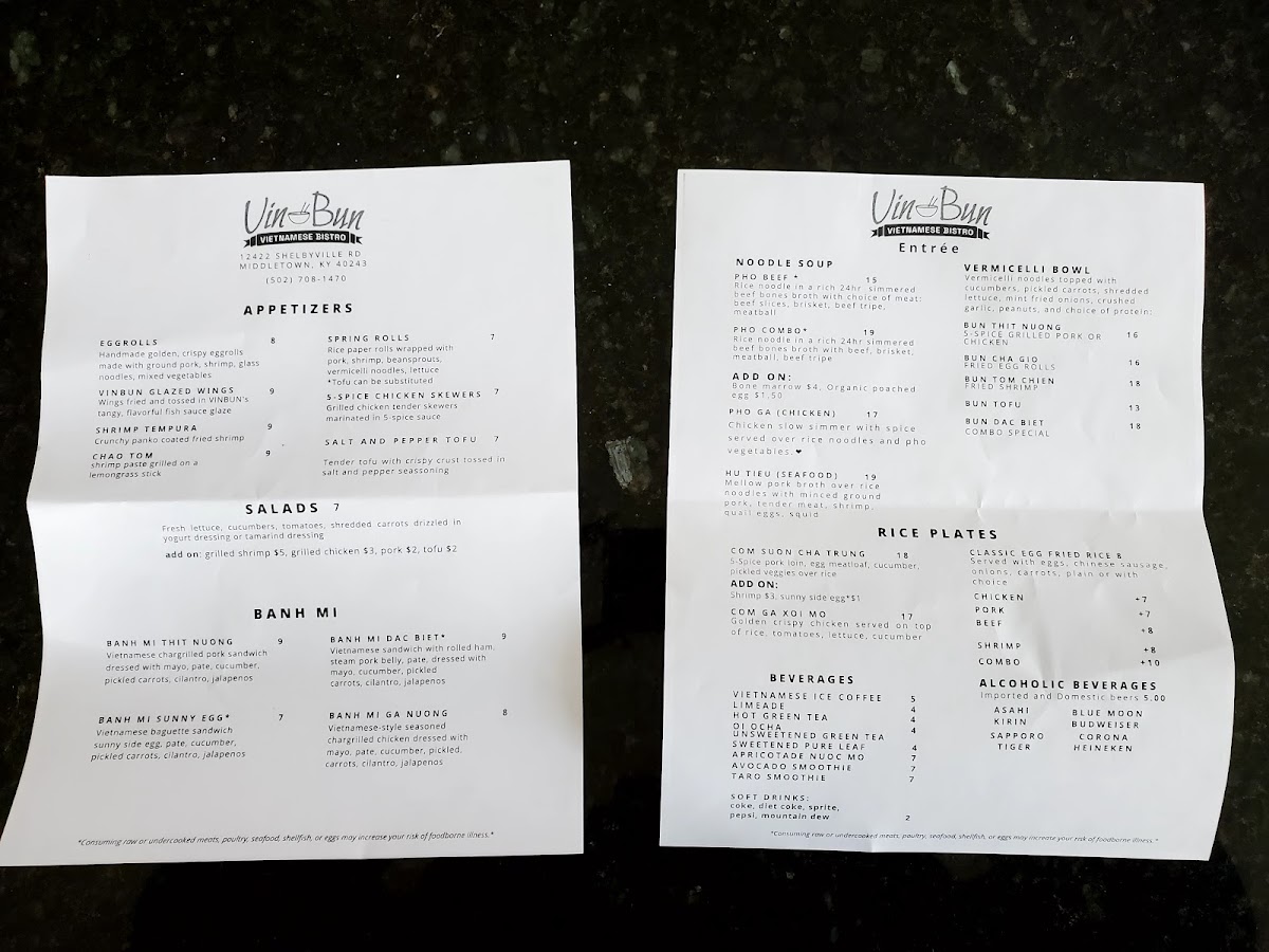VinBun Vietnamese Bistro Menu